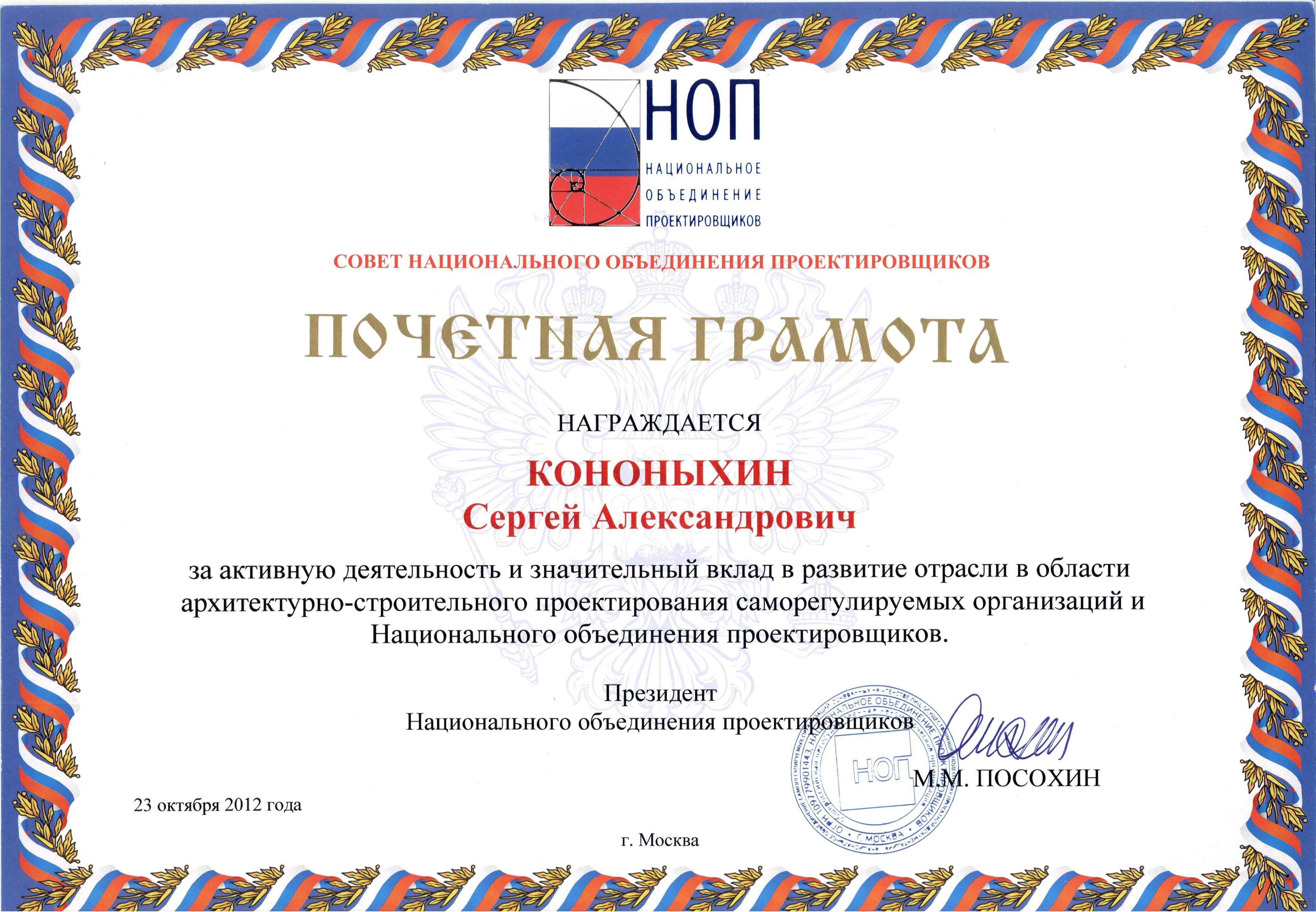 Сергей Кононыхин был отмечен почетной грамотой Национального объединения проектировщиков